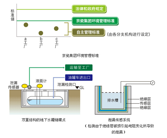 1992年,針對排氣、排水、土壤、地下水等,京瓷集團(tuán)制定了比法律和政府規(guī)定還要嚴(yán)格的《京瓷集團(tuán)環(huán)境管理標(biāo)準(zhǔn)》.而且,以該環(huán)境管理標(biāo)準(zhǔn)為基礎(chǔ),在各網(wǎng)點設(shè)定了更為嚴(yán)格的自主管理標(biāo)準(zhǔn),定期實施環(huán)境測量,貫徹環(huán)境管理.此外,出于防止土壤污染的考慮,制定了《土壤、地下水管理規(guī)程》,通過采用雙重結(jié)構(gòu)的地下罐儲藏點、引進(jìn)泄漏檢測系統(tǒng)等,致力于及時發(fā)現(xiàn)泄漏、防止污染擴(kuò)大.