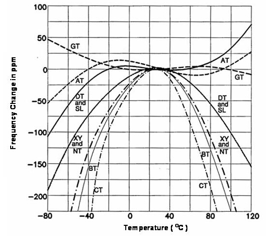 Frequency-temperature characteristics of various quartz cuts.