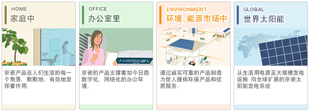家庭、辦公室、社區(qū)乃至世界各地,京瓷的產(chǎn)品已成為我們生活中不可或缺的一部分.例如,將太陽光轉(zhuǎn)換成清潔能源的住宅用太陽能發(fā)電系統(tǒng);用于打印機、復(fù)印機、電腦等辦公室里各種通信設(shè)備相關(guān)業(yè)務(wù)的電子零部件;豐富社區(qū)溝通的京瓷通信設(shè)備相關(guān)業(yè)務(wù)等,尤其,京瓷新開發(fā)的能源管理系統(tǒng)可以有效控制電耗.從無電地區(qū)到大型太陽能發(fā)電站,京瓷的太陽能發(fā)電系統(tǒng)產(chǎn)生的清潔能源發(fā)揮著積極重要的作用.京瓷將通過各種高品質(zhì)產(chǎn)品,為提高人們的生活水平做出貢獻.