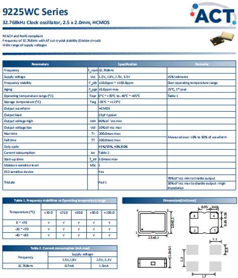 ACT晶振,9225WC晶振,有源晶體振蕩器.貼片晶振本身體積小,超薄型石英晶體振蕩器,特別適用于有目前高速發展的高端電子數碼產品,因為晶振本身小型化需求的市場領域,小型,薄型是對應陶瓷振蕩器(偏差大)和普通的石英晶體振蕩器(偏差?。┑闹虚g領域的一種性價比較出色的產品.產品廣泛用于筆記本電腦,無線電話,衛星導航HDD, SSD, USB, Blu-ray等用途,符合無鉛焊接的高溫回流焊曲線特性.
