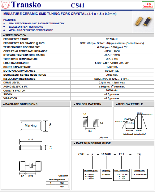 Transko晶振,CS41晶振,音叉晶體.貼片壓電石英晶體,體積小,焊接可采用自動貼片系統(tǒng),產(chǎn)品本身小型,表面貼片晶振,特別適用于有小型化要求的電子數(shù)碼產(chǎn)品市場領域,因產(chǎn)品小型,薄型優(yōu)勢,耐環(huán)境特性,包括耐高溫,耐沖擊性等,在移動通信領域得到了廣泛的應用,晶振產(chǎn)品本身可發(fā)揮優(yōu)良的電氣特性,滿足無鉛焊接的高溫回流溫度曲線要求.