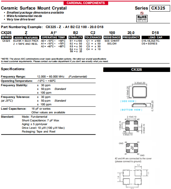 Cardinal晶振,CX325晶振,壓電石英晶體.小型貼片石英晶振,外觀尺寸具有薄型表面貼片型石英晶體諧振器,特別適用于有小型化要求的市場領域,比如智能手機,無線藍牙,平板電腦等電子數碼產品.晶振本身超小型,薄型,重量輕,晶體具有優良的耐環境特性,如耐熱性,耐沖擊性,在辦公自動化,家電相關電器領域及Bluetooth,Wireless LAN等短距離無線通信領域可發揮優良的電氣特性,滿足無鉛焊接的回流溫度曲線要求.