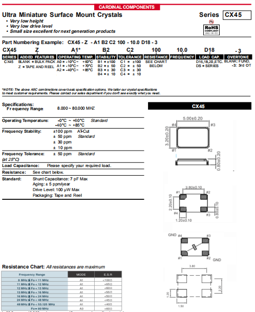Cardinal晶振,CX45晶振,低功耗石英晶體.智能手機(jī)晶振,產(chǎn)品具有高精度超小型的表面貼片型石英晶體振蕩器,最適用于移動通信終端的基準(zhǔn)時(shí)鐘等移動通信領(lǐng)域.比如智能手機(jī),無線通信,衛(wèi)星導(dǎo)航,平臺基站等較高端的數(shù)碼產(chǎn)品,晶振本身小型,薄型具備各類移動通信的基準(zhǔn)時(shí)鐘源用頻率,貼片晶振具有優(yōu)良的電氣特性,耐環(huán)境性能適用于移動通信領(lǐng)域,滿足無鉛焊接的高溫回流溫度曲線要求.