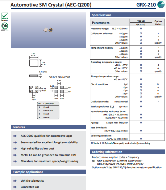 Golledge晶振,GRX-210晶振,高質(zhì)量石英晶體.小型貼片石英晶振,外觀尺寸具有薄型表面貼片型石英晶體諧振器,特別適用于有小型化要求的市場領(lǐng)域,比如智能手機,無線藍牙,平板電腦等電子數(shù)碼產(chǎn)品.晶振本身超小型,薄型,重量輕,晶體具有優(yōu)良的耐環(huán)境特性,如耐熱性,耐沖擊性,在辦公自動化,家電相關(guān)電器領(lǐng)域及Bluetooth,WirelessLAN等短距離無線通信領(lǐng)域可發(fā)揮優(yōu)良的電氣特性,滿足無鉛焊接的回流溫度曲線要求.