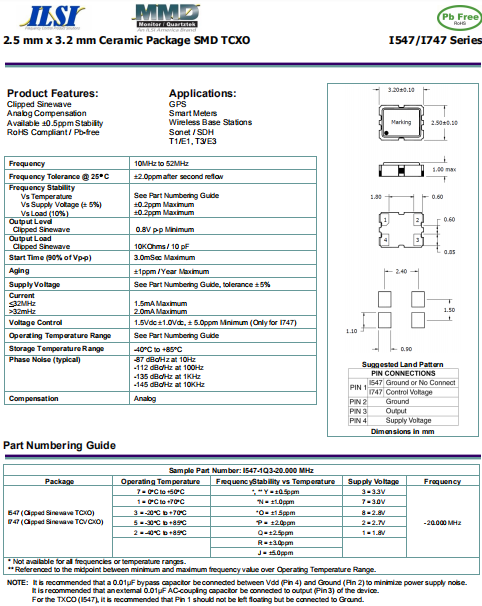 ILSI晶振,I747晶振,VC-TCXO振蕩器.貼片式石英晶體振蕩器,低電壓啟動功率,并且有多種電壓供選擇,比如有1.8V,2.5V,3.3V,3.8V,5V等,產品被廣泛應用于,平板筆記本,GPS系統,光纖通道,千兆以太網,串行ATA,串行連接SCSI,PCI-Express的SDH / SONET發射基站等領域.符合RoHS/無鉛.
