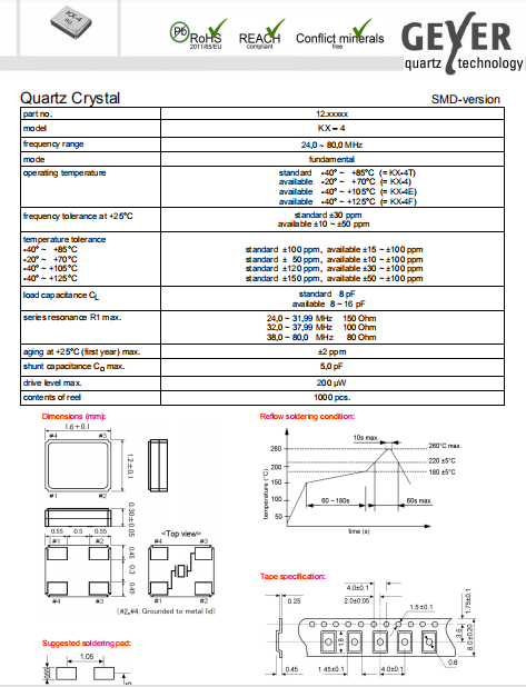 Geyer晶振,KX-4晶振,低功耗環(huán)保晶體.小型表面貼片晶振型,是標(biāo)準(zhǔn)的石英晶體諧振器,適用于寬溫范圍的電子數(shù)碼產(chǎn)品,家電電器及MP3,MP4,播放器,單片機等領(lǐng)域.可對應(yīng)24.000MHz以上的頻率,在電子數(shù)碼產(chǎn)品,以及家電相關(guān)電器領(lǐng)域里面發(fā)揮優(yōu)良的電氣特性,滿足無鉛焊接的回流溫度曲線要求.