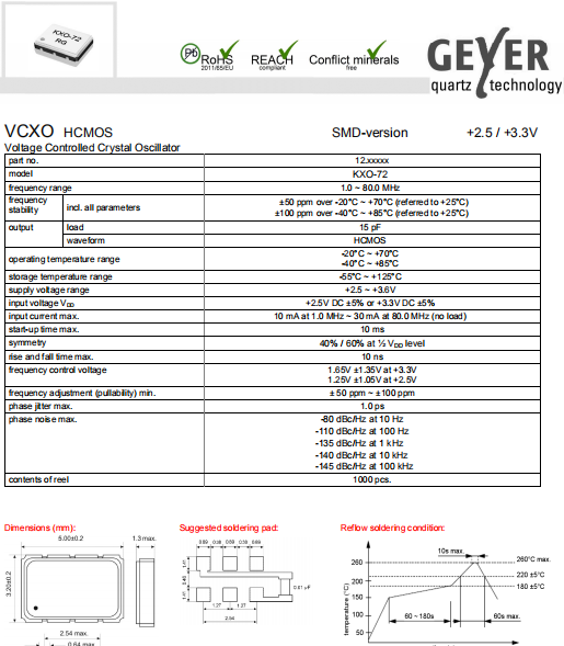 Geyer晶振,KXO-72晶振,環保振蕩器.VCXO晶振具有最適合于移動通信設備用途的高穩定的頻率溫度特性.為對應低電源電壓的產品.(可對應DC +1.8 V±0.1 V to +3.2 V±0.1 V )高度:最高1.0 mm,體積:0.007 cm3,重量:0.024g,超小型,輕型.低消耗電流,表面貼片型產品.(可對應回流焊) 無鉛產品.滿足無鉛焊接的回流溫度曲線要求.