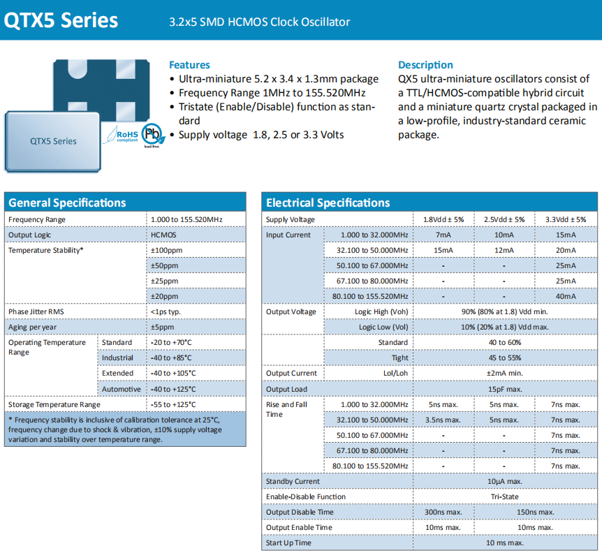 Quarztechnik晶振,QTX5晶振,高質量振蕩器.5032mm體積的石英晶體振蕩器有源晶振,改產品可驅動2.5V的溫補晶振,壓控晶振,VC-TCXO晶體振蕩器產品,電源電壓的低電耗型,編帶包裝方式,可對應自動高速貼片機自動焊接,及IR回流焊接(無鉛對應),為無鉛產品,超小型,質地輕.產品被廣泛應用到集成電路,程控交換系統,無線發射基站.