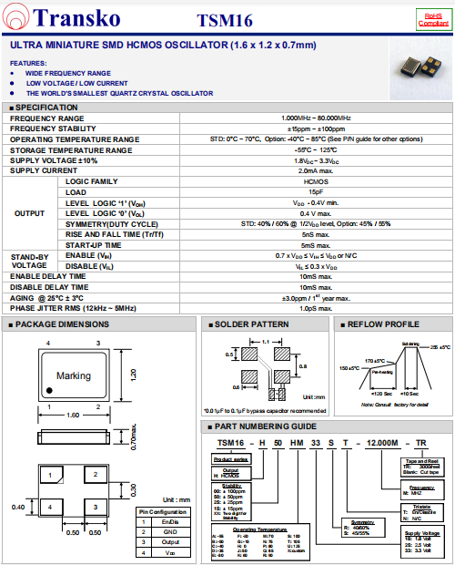 Transko晶振,TSM16晶振,高精度晶振.小體積SMD時鐘晶體振蕩器,是貼片石英晶振,兆赫頻率元件,應(yīng)用于時鐘模塊,智能手機,全球定位系統(tǒng),因產(chǎn)品本身體積小,SMD編帶型,可應(yīng)用于高性能自動貼片焊接,被廣泛應(yīng)用到各種小巧的便攜式消費電子數(shù)碼時間產(chǎn)品,環(huán)保性能符合ROHS/無鉛標(biāo)準(zhǔn).