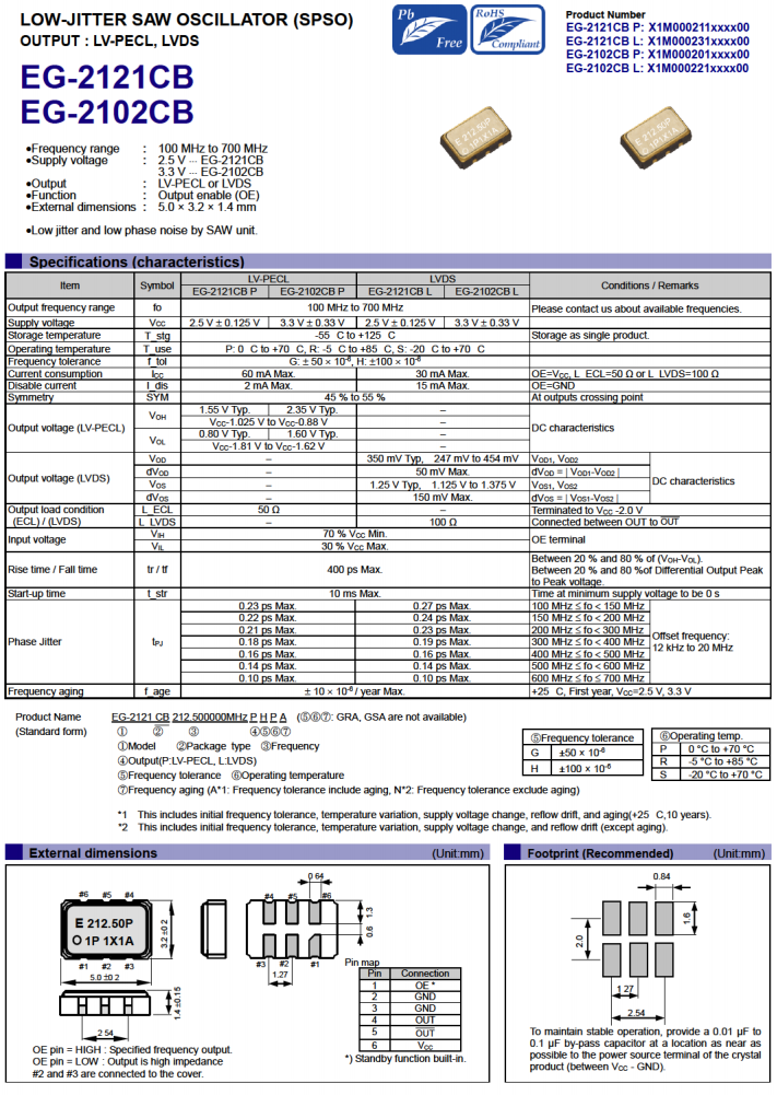 | X1M0002110003 | EG-2121CB | 156.250000 MHz | 5.00 x 3.20 x 1.40 mm | LV-PECL | 2.375 to 2.625 V |