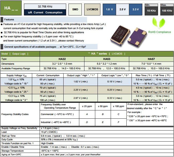 MERCURY晶振,MERCURY時鐘振蕩器,HA32晶振.貼片有源石英晶振是指在普通無源晶體上增加了電壓,內部集成了相應IC與電容電阻,需要在凈化萬級車間生產,并且在密封機器設備中焊接加蓋,內部封裝模式是指在真空封裝區域內進行封裝.1.防止外界氣體進入組件體內受到污染和增加應力的產生;2.使組件在真空下電阻減小;3.氣密性高.此技術為研發及生產超小型,超薄型石英晶體元器必須攻克的關鍵技術之一