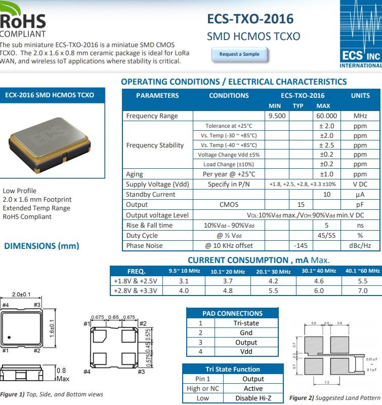 PARAMETERS CONDITIONS ECS-TXO-2016 UNITS MIN TYP MAX Frequency Range 9.500 60.000 MHz Frequency Stability Tolerance at +25°C ± 2.0 ppm Vs. Temp (-30 ~ +85°C) ±2.0 ppm Vs. Temp (-40 ~ +85°C) ± 2.5 ppm Voltage Change Vdd ±5% ±0.2 ppm Load Change (±10%) ±0.2 ppm Aging Per year @ +25°C ±1.0 ppm Supply Voltage (Vdd) Specify in P/N +1.8, +2.5, +2.8, +3.3 ±10% V DC Standby Current 10 µA Output CMOS 15 pF Output voltage Level VOL:10%Vdd max./VOH:90%Vdd min.V DC Rise & Fall time 10%Vdd – 90%Vdd 5 ns Duty Cycle @ ½ Vdd 45/55 % Phase Noise @ 10 KHz offset -145 dBc/Hz