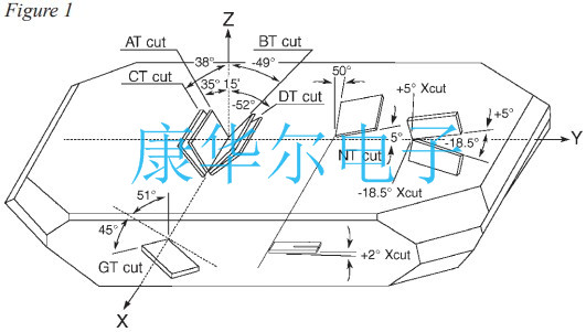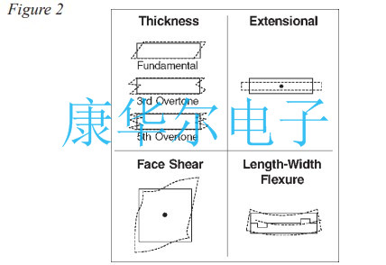 如上所示的元素以各種模式振動,其中最重要的是伸展的,彎曲的和剪切.振動模式決定了晶振最大頻率,穩定性與溫度,和給定元素的阻力.各種模式振動如圖2所示,同時進行比較各種頻率穩定性與溫度有關如圖3所示.