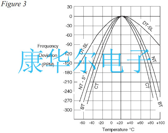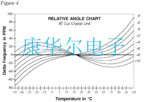 在各種元素中,貼片石英晶振的“AT”切割成了最受歡迎的,因為它是相對較高的頻率,表現出優異的頻率與溫度穩定性并且以合理的成本廣泛獲得.該“AT”切割的頻率與溫度能力晶體單元如圖4所示.