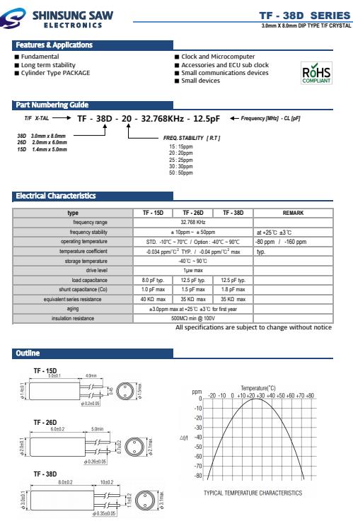 所有石英晶體諧振器和實(shí)時時鐘模塊都以IC形式提供.SHINSUNG晶振,TF-26D插件音叉晶體,TF-26D-15-32.768KHz-12.5pF晶振.