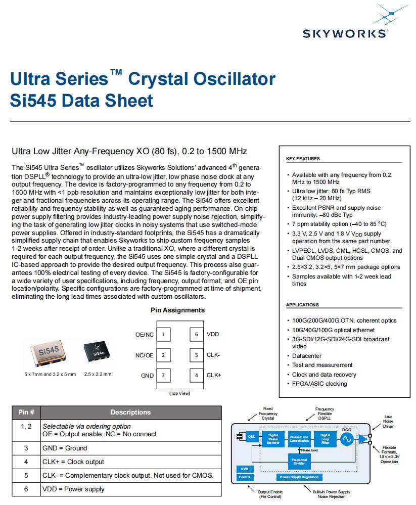| 545BAA100M000ACG | Skyworks Solutions Inc. | Ultra™ Si545 | 100 MHz | LVDS | 1.8V ~ 3.3V | ±20ppm |