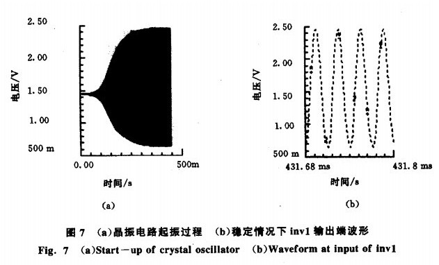所有電路參數(shù)都設(shè)置好之后,使用Spectre進(jìn)行電路仿真,可以得到晶振電路的起振過程及穩(wěn)態(tài)下的波形.從圖7(a)中可以清楚的看到晶振電路的起振過程,一般的起振時(shí)間需要幾百個(gè)ms.穩(wěn)定情況下invl的一端是正弦波,另一端是被放大了的近似方波,需要圖1中所示的inv2進(jìn)行整型得到外形較好的方波并提供足夠的驅(qū)動能力驅(qū)動后面的數(shù)字電路.