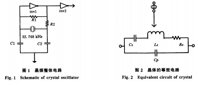 如圖1 所示是晶振的整體電路.R1為反相器invl提供偏置,使其中的MOS管工作在飽和區(qū)以獲得較大的增益;C1,C2和雜散電容一起構(gòu)成晶體的電容負(fù)載, 同時(shí)它們和反相器invl一起可以等效為一負(fù)阻, 為晶體提供其振蕩所需要的能量; R2用來降低對晶體的驅(qū)動能量, 以防止晶體振壞或出現(xiàn)異常; 反相器inv2對invl的輸出波形整形并驅(qū)動負(fù)載.