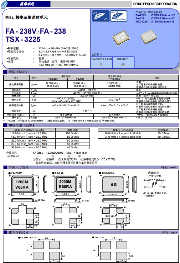 愛普生晶振FA-238是一款小體積尺寸3.2x2.5mm無源晶振,石英晶體諧振器,四腳貼片晶振,頻率范圍16MHz至60MHz,工作溫度-40℃至+85℃(+105℃),具有超小型,輕薄型,耐熱,耐振,耐沖擊等優(yōu)良的耐環(huán)境特性。特別適用于小型便捷式移動通訊,可穿戴設(shè)備,智能手機,平板電腦,便捷式電子儀器,汽車電子,智能家居等。