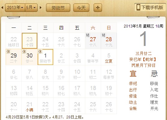 奉天承運(yùn),國家黨的安排,2013年5月1號勞動節(jié)放假時間如下,4月29號,30號-5月1號,共三天。