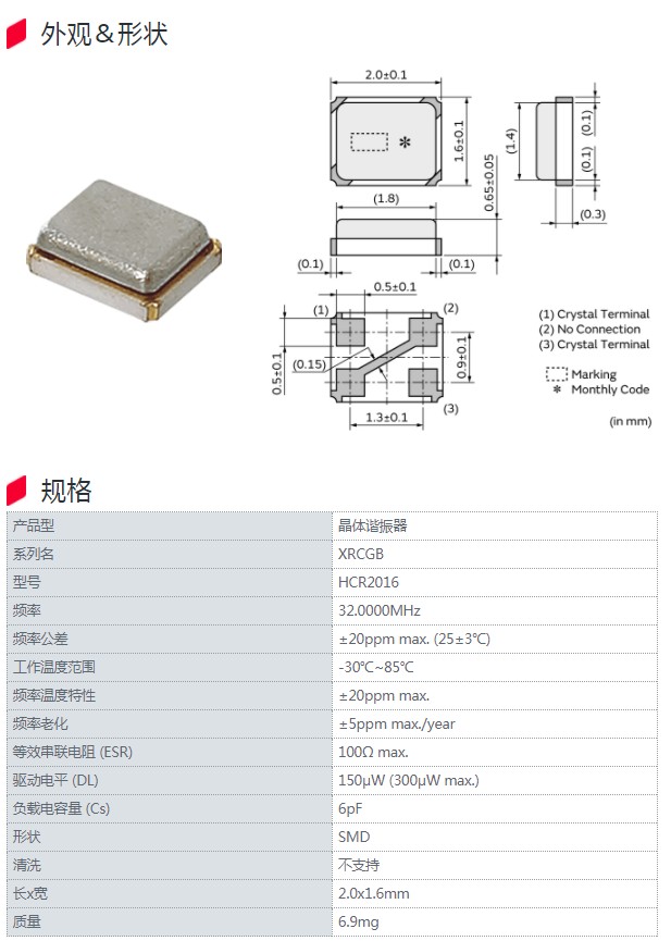 | XRCGB32M000F1H03R0 | HCR2016 | 32.0000MHz | ±10ppm max. (25±3℃) | 消費級 |