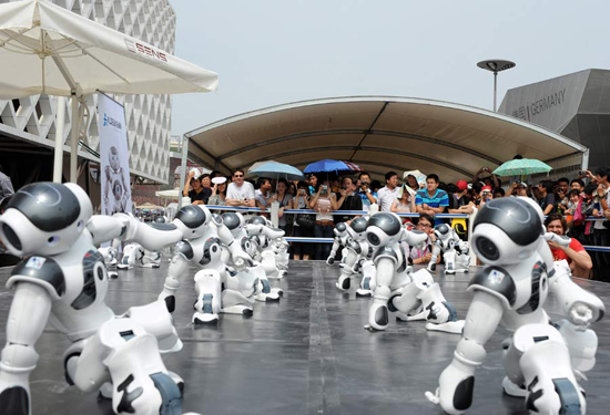 上海世博會迎來法國館國家館日活動。在法國館外,20個憨態可掬的機器人“腦”和著音樂的節拍,為觀眾帶來精彩的集體舞表演,吸引了眾多觀眾觀看。據介紹,身高58厘米的機器人“腦”,跳舞、爵士樂、足球樣樣精通,還通曉20多個國家的語言,被一些觀眾稱為“小天才”。