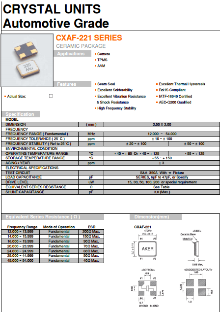 AKER晶振,AKER貼片晶振,CXAF-221諧振器.貼片石英晶體,體積小,焊接可采用自動貼片系統,產品本身小型,表面貼片晶振,特別適用于有小型化要求的電子數碼產品市場領域,因產品小型,薄型優勢,耐環境特性,包括耐高溫,耐沖擊性等,在移動通信領域得到了廣泛的應用,晶振產品本身可發揮優良的電氣特性,滿足無鉛焊接的高溫回流溫度曲線要求.