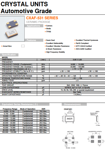 AKER晶振,貼片石英晶體,CXAF-531臺灣晶振,安碁科技成立于西元1990年,主要從事貼片石英晶振產品的研發、制造及銷售.擁有深厚的研發技術底蘊,為晶體振蕩器之專業制造公司.深耕臺灣、布局全球.在美國與中國大陸均設有據點,提供客戶最及時的服務,朝客戶導向目標邁進.科技不斷的進步,安碁科技亦不斷提升技術服務.透過與客戶緊密的互動,了解客戶需求,提供客戶全方位的技術支援─TotalSolution;貫徹安碁誠信為首、專業化客戶服務及品質優先的理念.